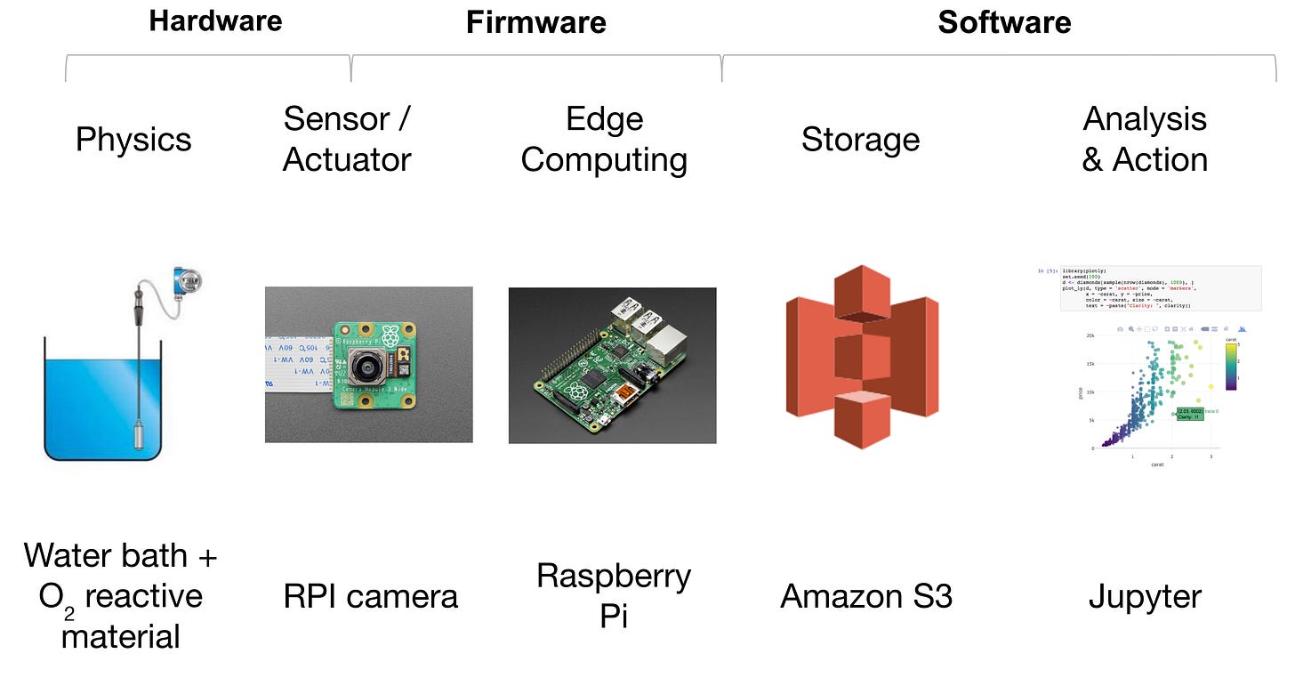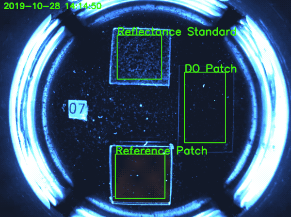 Osmo Systems was developing their sensor technology around small chemical patches that fluoresced proportional to the absence of dissolved oxygen (DO), i.e. the fluorescence was less bright when more DO was present. These patches are traditionally read using an expensive piece of equipment called a phase fluorometer. Osmo Systems bet on being able to measure those changes accurately enough using simpler technology, first with simple photodiodes, and later with off-the-shelf cameras.